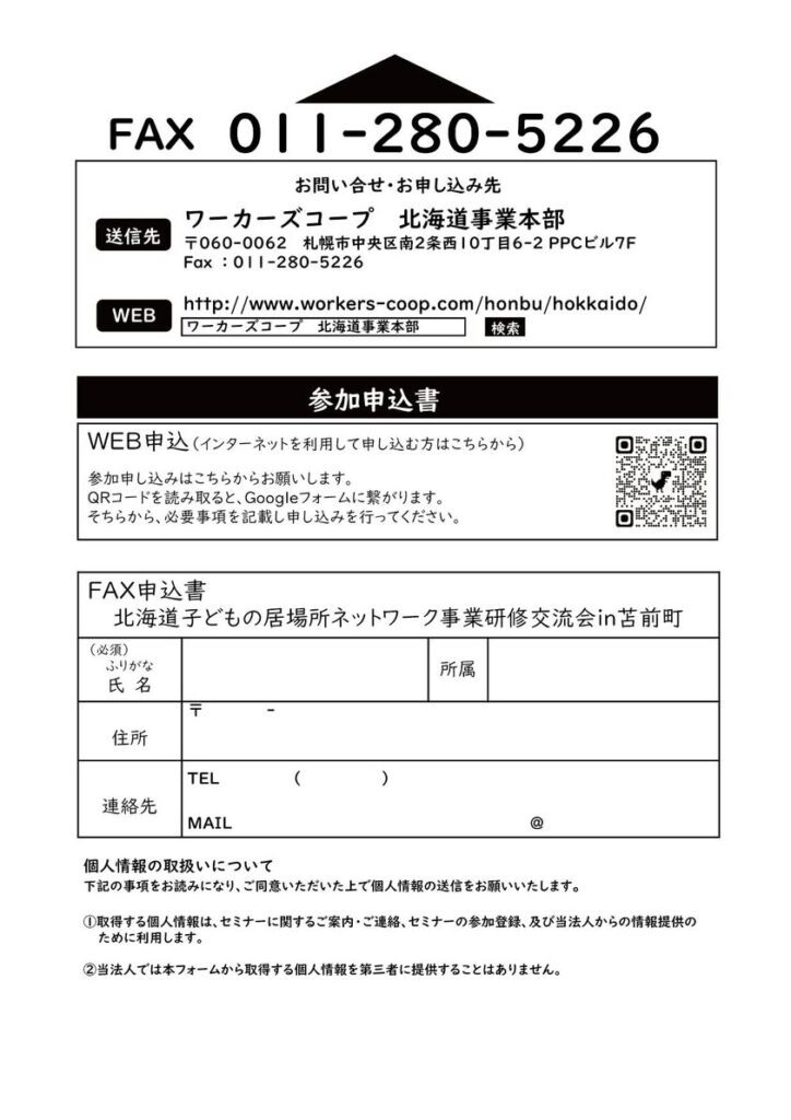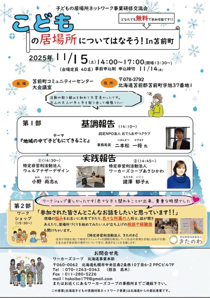 11月15日(土)苫前町にて、子供の居場所ネットワーク事業研修交流会「こどもの居場所について話そう!」があります。